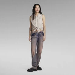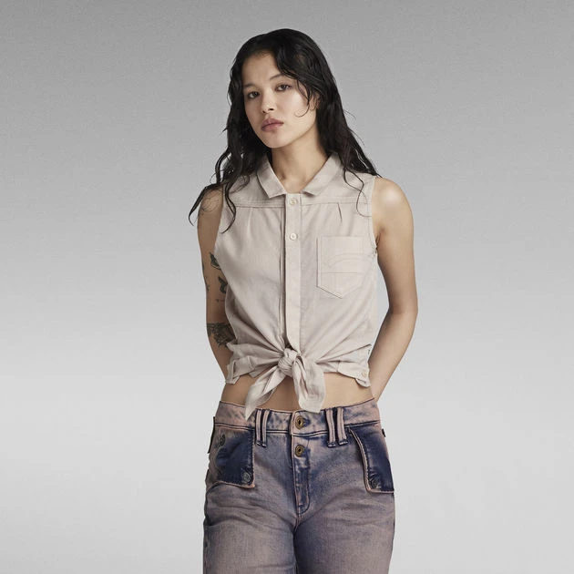This sleeveless shirt is part of our limited edition Y2K collection which features styles from the 00’s, taken straight from our archive. The hem is cut rounded and extended at the front to allow for a knot finish. The button closure at the front is partly concealed. At the waist. a tab is added with a button. The chest pocket makes it complete.